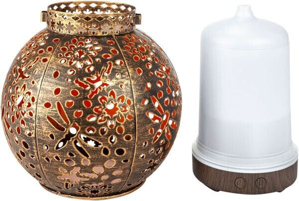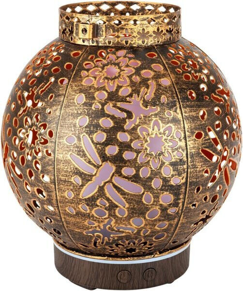Dieser orientalisch anmutende Aroma Diffuser sorgt für wunderbares Wohlfühl-Klima in Ihrem Zuhause, und das gleich auf dreifache Art und Weise: Als Luftbefeuchter erfrischt er Ihre Raumluft und verteilt auf sanfte Art Wassermoleküle, um der oft durchs Heizen zu trockenen Luft in Innenräumen entgegenzuwirken. Zugleich ist der Aroma Diffuser ein dezenter Duftspender: Fügen Sie ein Aromaöl Ihrer Wahl hinzu, verbreitet sich sanft und unaufdringlich eine angenehme Atmosphäre in Ihren vier Wänden. Das exklusive Design im Stil einer orientalischen Lampe bezaubert als Stimmungslicht mit geheimnisvollem Flair: Die LED-Beleuchtung mit Farbwechsel taucht jeden Raum in eine zauberhaft-romantische Lichtstimmung, bei der Sie sicher wunderbar entspannen können.