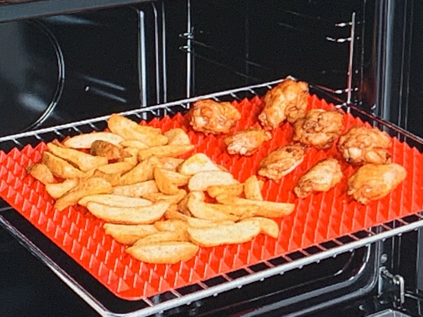 Perfekte Ergebnisse dank Heißluft-Effekt: Die erhabenen Noppen lassen die heiße Umluft ungehindert um Ihre Speisen zirkulieren und sie von allen Seiten rösten. So ist auch kein Wenden nötig!