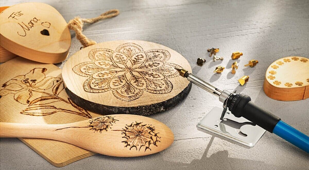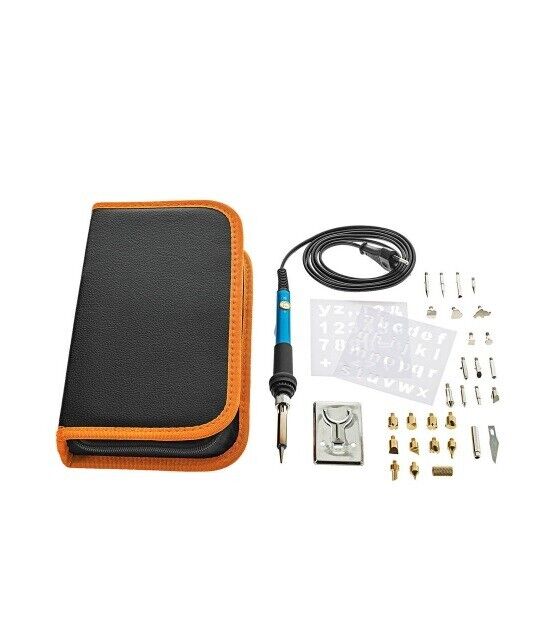 Das Set enthält einen Brenner, 27 Aufsätze, Stifte und Stempel, Buchstaben- und Zahlenschablonen sowie ein Messer. In einer Aufbewahrungstasche. Netzteil, Kabellänge 141 cm, Leistung 60 W, Temperatur 200 - 450 °C.