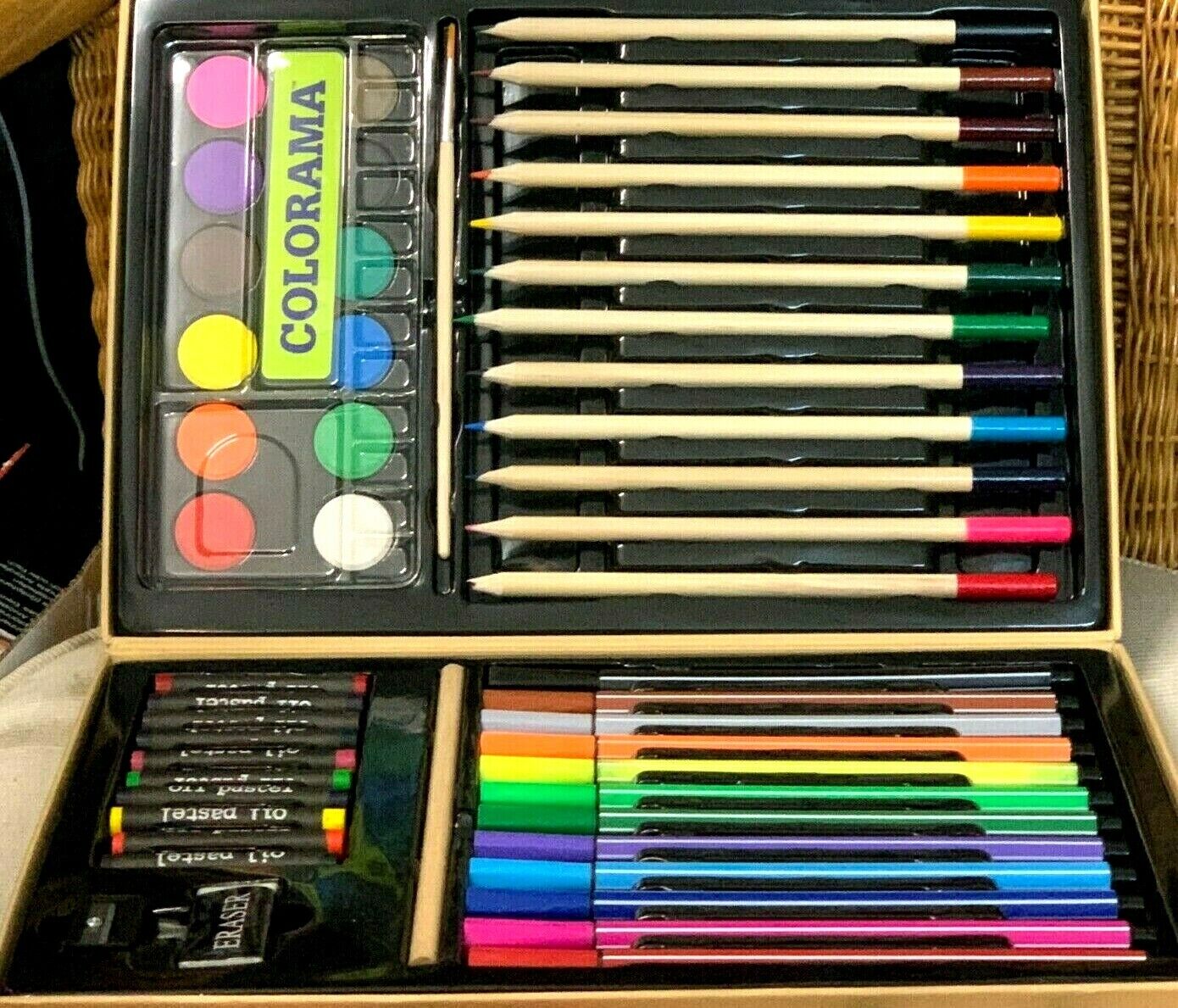 Großes Holzmalset bestehend aus Buntstiften Holzstifte Wachsmalstifte Wassermalfarben Radiergummi Anspitzer im Koffer