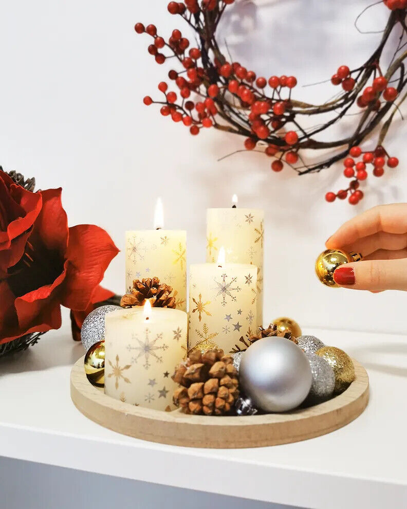 - Kerzen in unteschiedlichen Farben, mit Schneeflocken-Dekor (silber- und goldfarben)