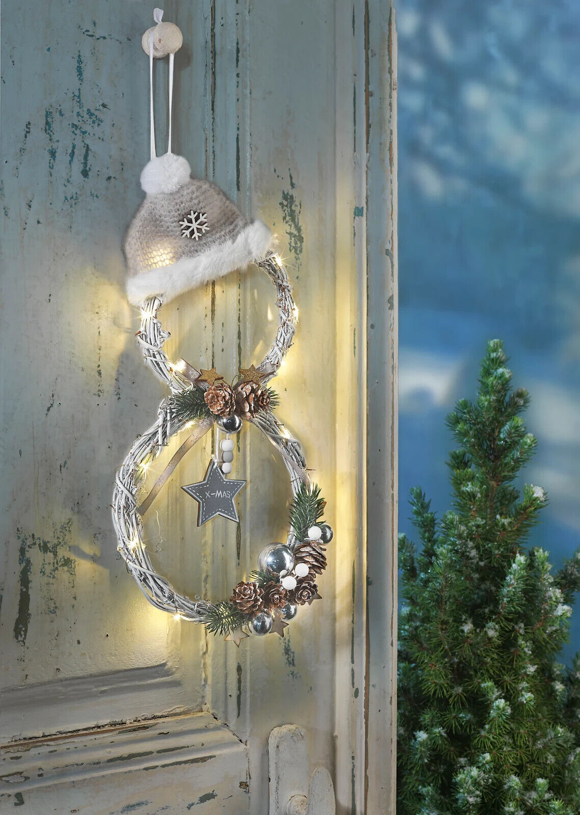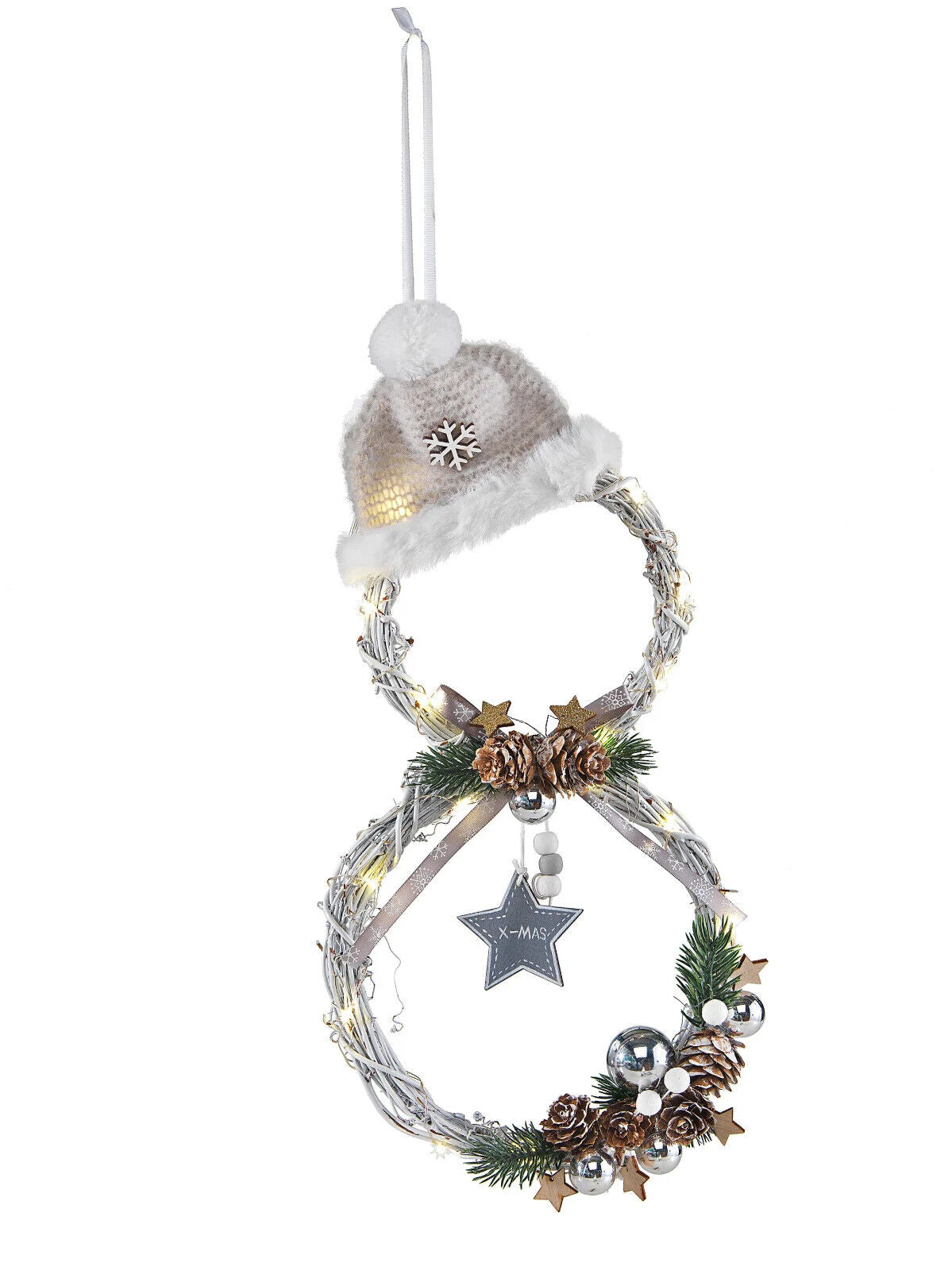 • 2 weiße Rattankränze ergeben einen stilisierten Schneemann