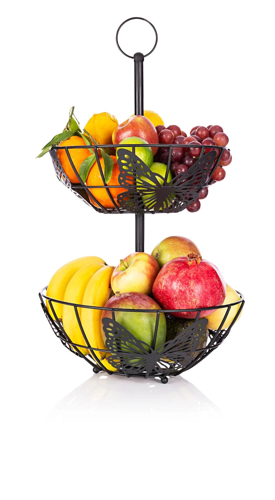Schmucker Platzsparer mit 2 Ebenen. Diese Etagère bietet rund ums Jahr Platz für frisches, saisonales Obst - und Sie haben diese gesunden Köstlichkeiten jederzeit griffbereit. Die Etagère ist mit feinen Metall-Schmetterlingen verziert, praktisch und schön in der Küche, auf dem Sideboard oder auf dem Tisch ...