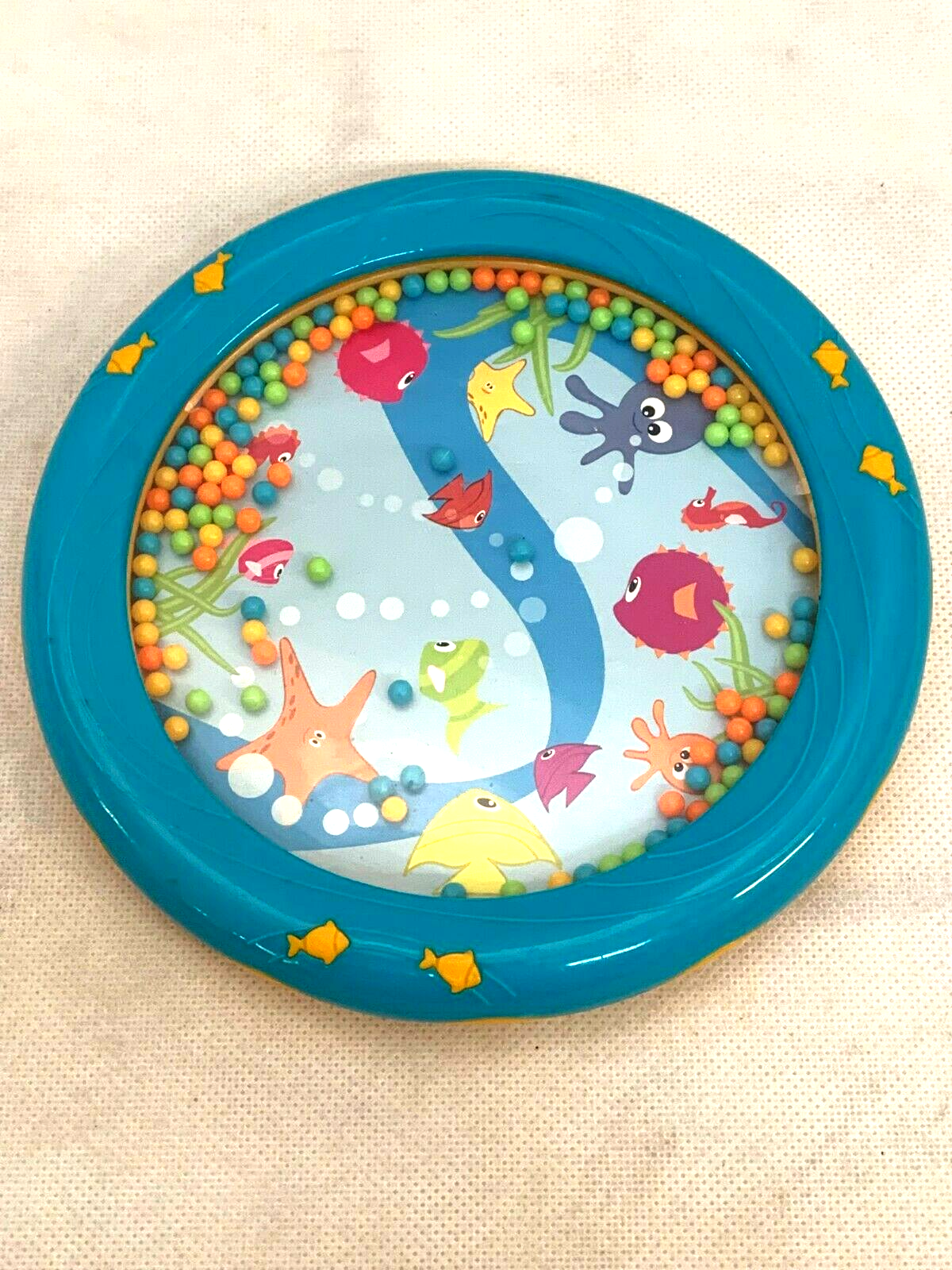 Leicht kippen und lauschen, wie die bunten Kügelchen sich in der flachen Meerestrommel mit einem Rauschen über die lustigen Fischapplikationen hinweg bewegen, das macht Spaß. Auch als Rassel lässt sich die Meerestrommel wunderbar einsetzen.