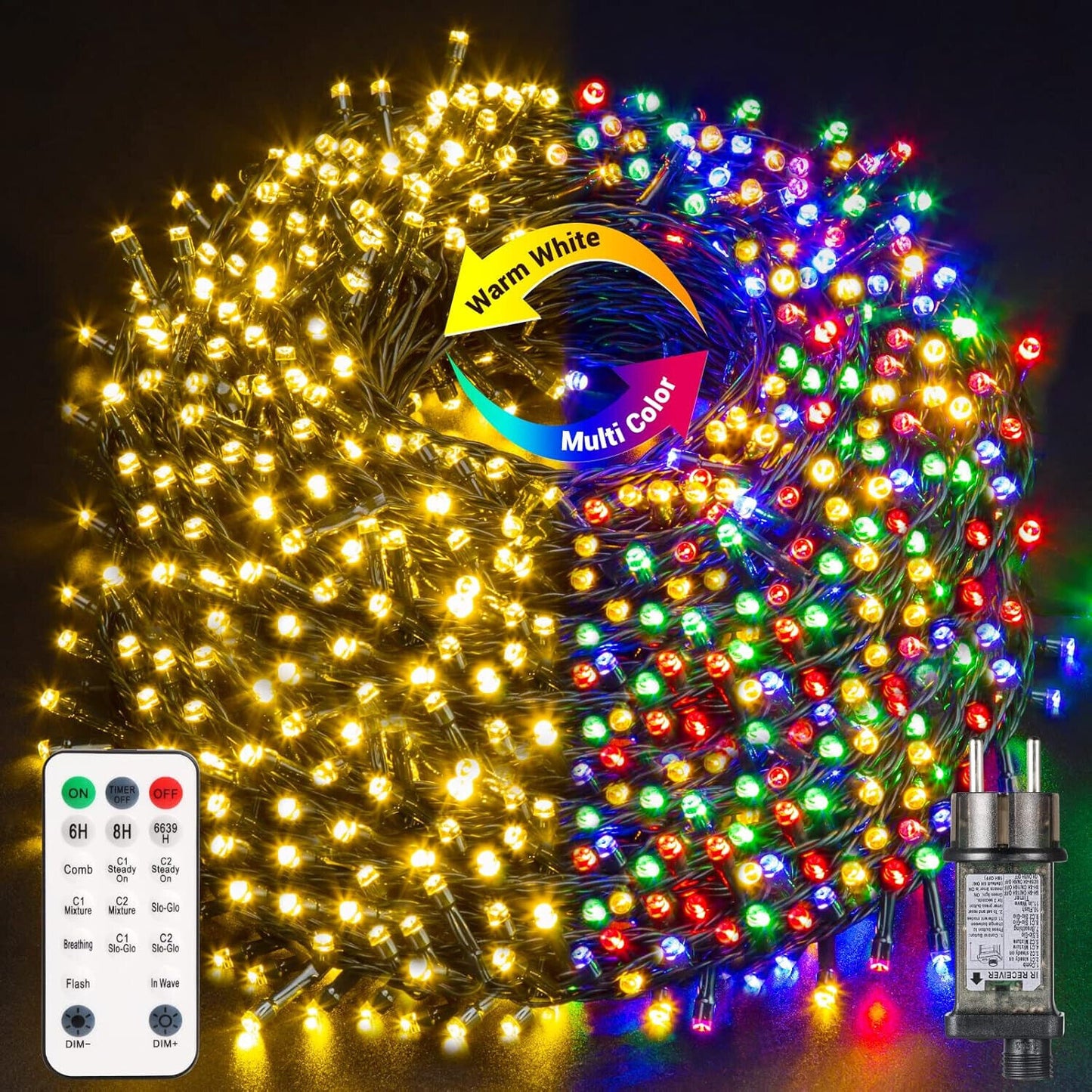 - 100M Farbwechselnde Lichterketten: Unsere Lichterketten bestehen aus 1000 farbwechselnden Lampenperlen, die die Farbe der Lichterkette von warmweiß auf mehrfarbig ändern können. Mitgeliefertes abnehmbares 3M-Verlängerungskabel, robustes Netzkabel erleichtert Außendekorationen mit Weihnachtslichtern, um eine verfügbare Steckdose zu erreichen. Sie können warmes Licht für eine ruhige Zeit und Multicolor für eine aufregende Zeit wählen.